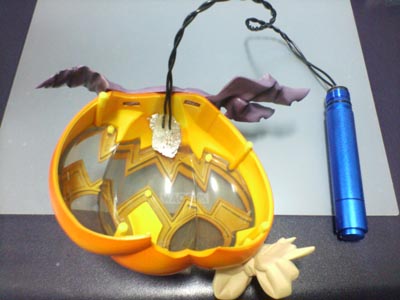 カボチャの口部分の下あたりに豆球をセット!位置が難しいんですけど
